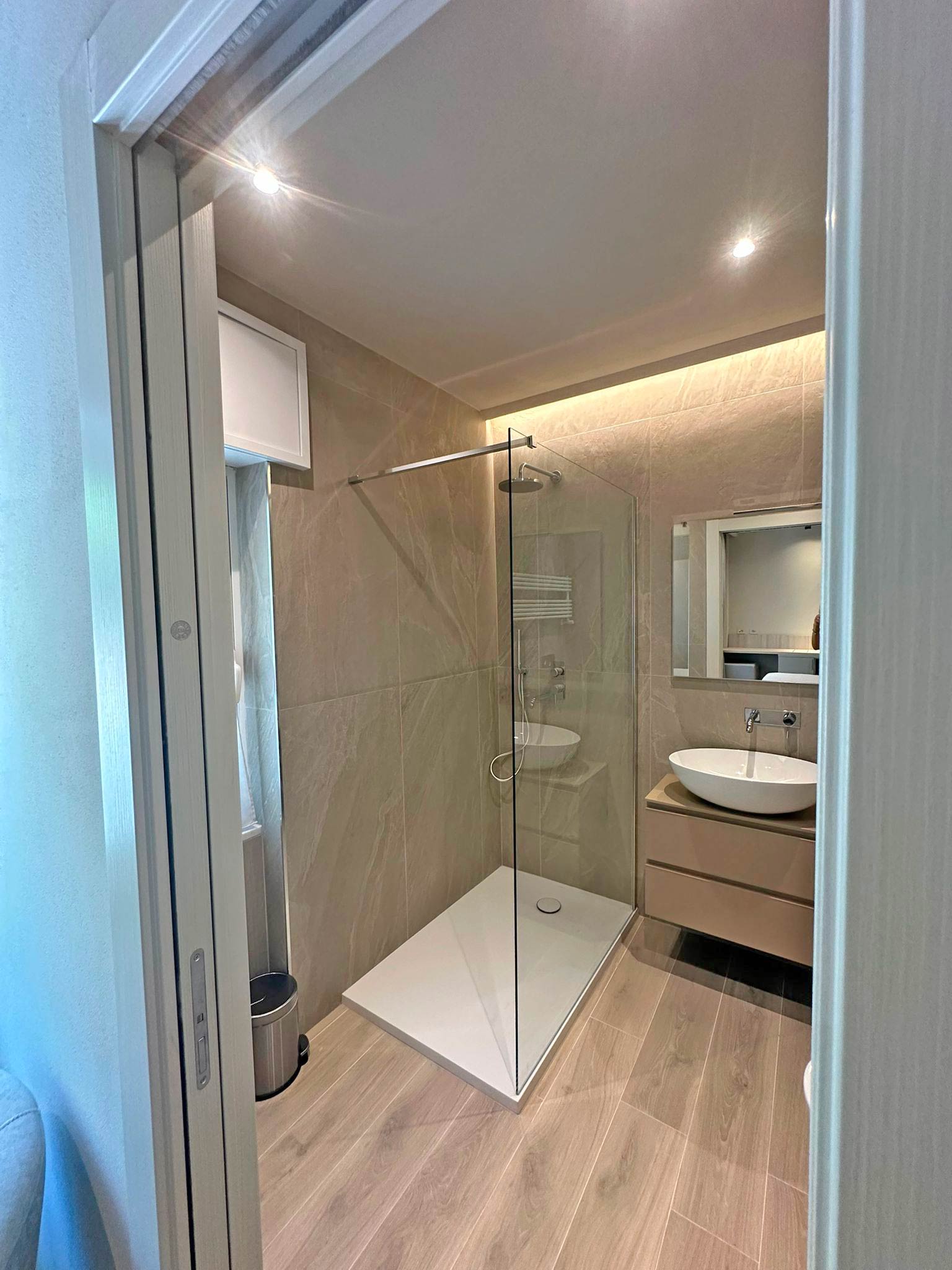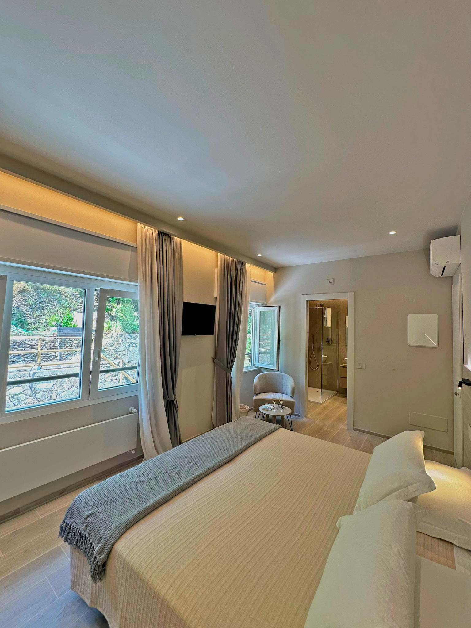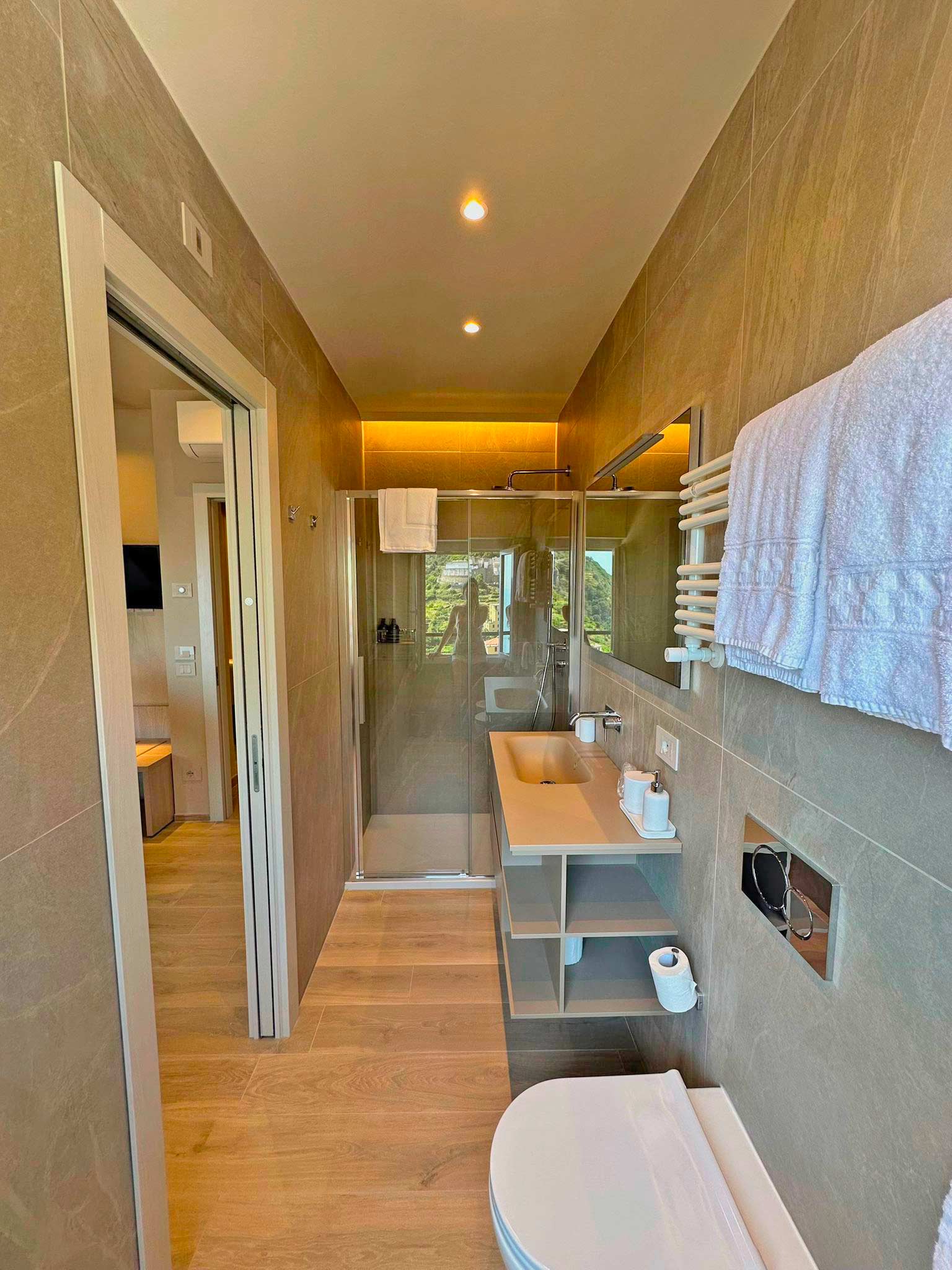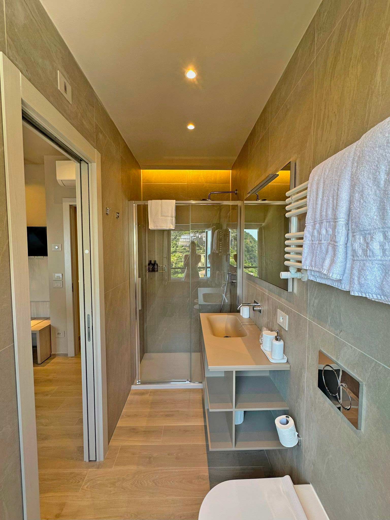 Intimate, elegant guest room with spacious walk-in shower, offers beautiful, lateral sea views