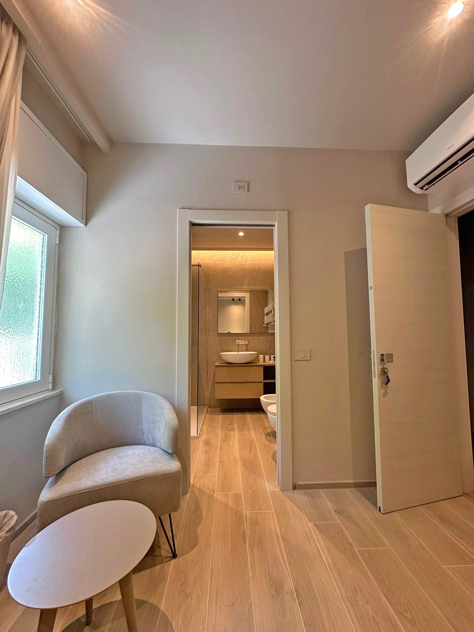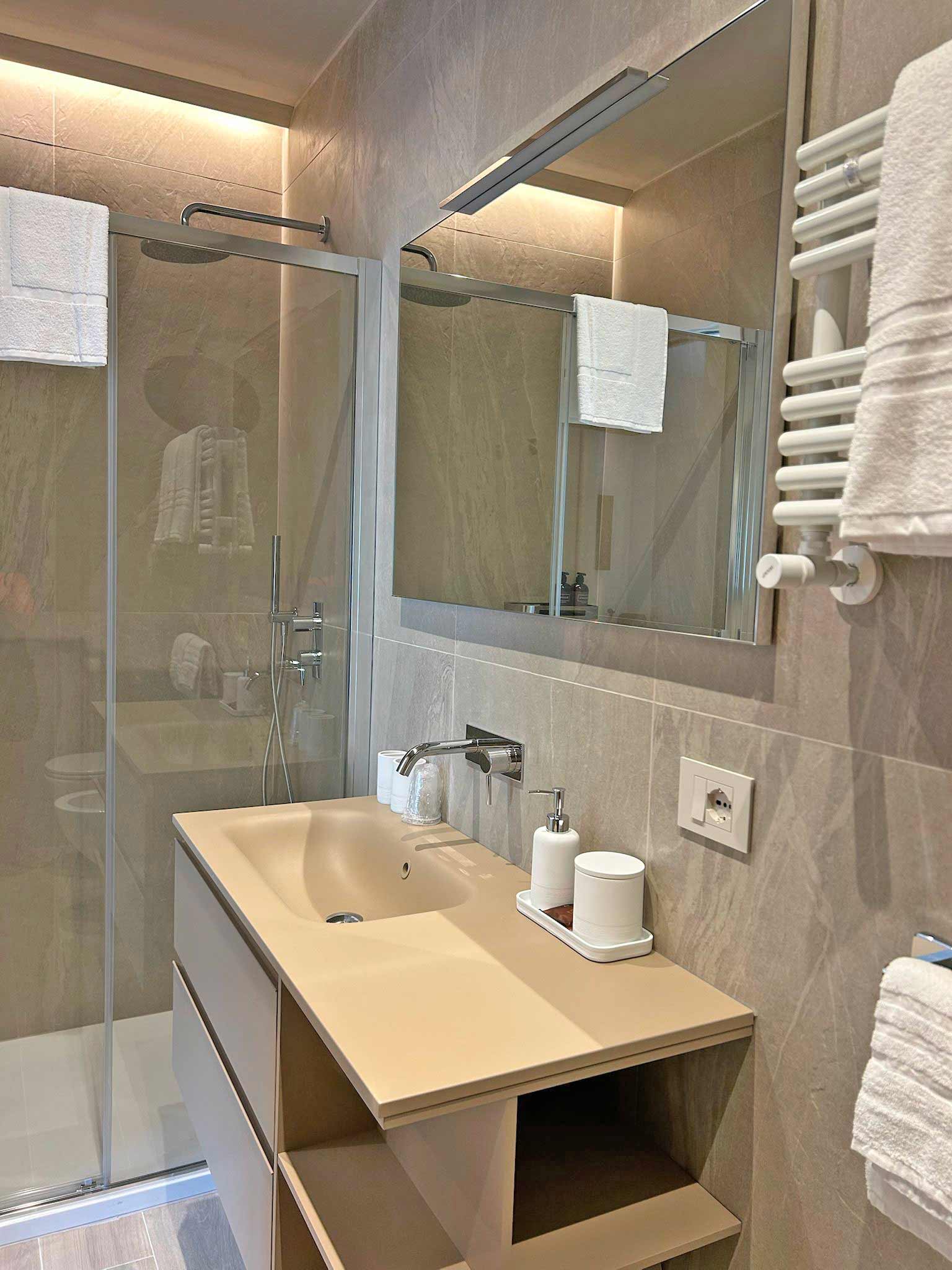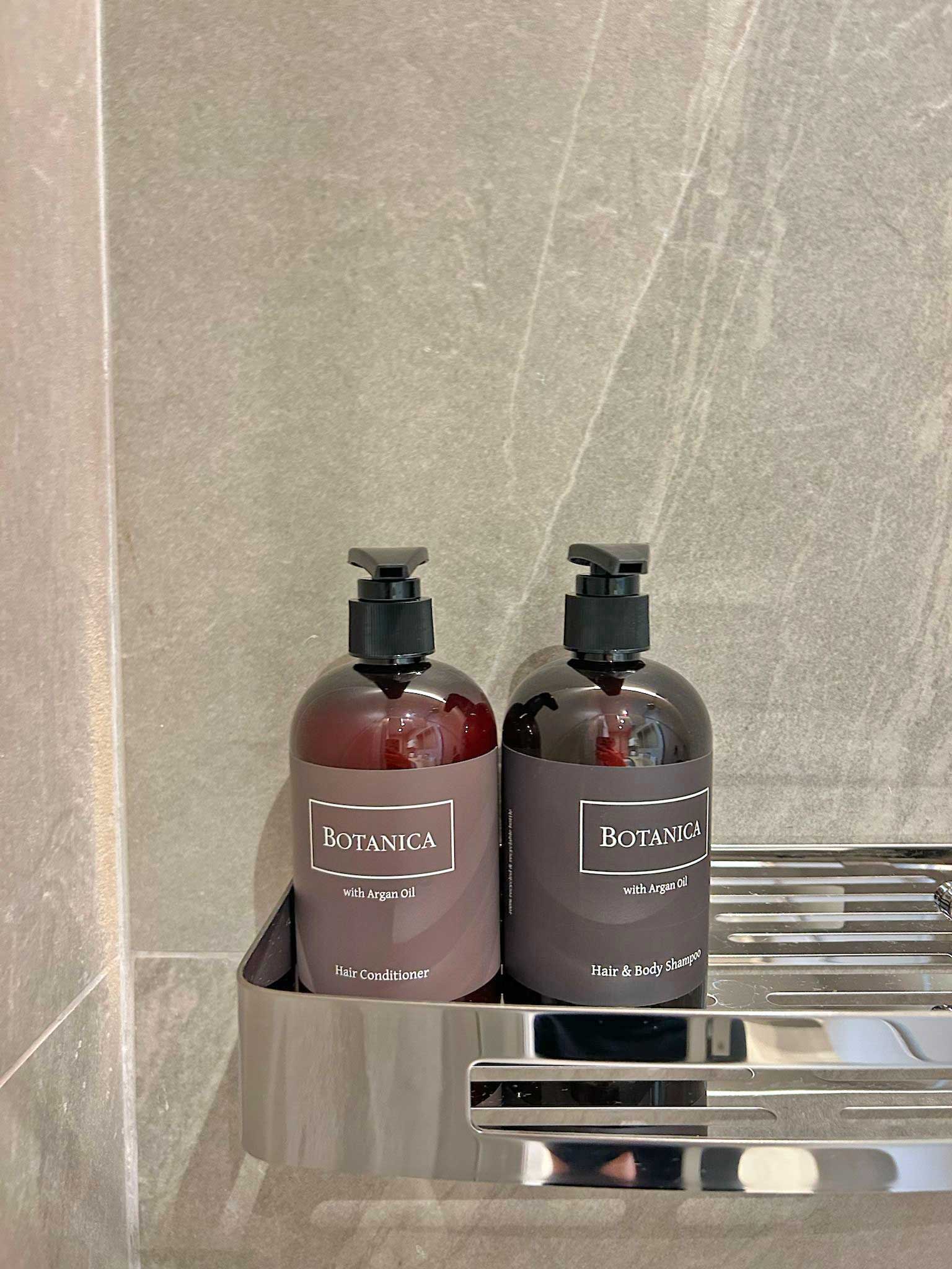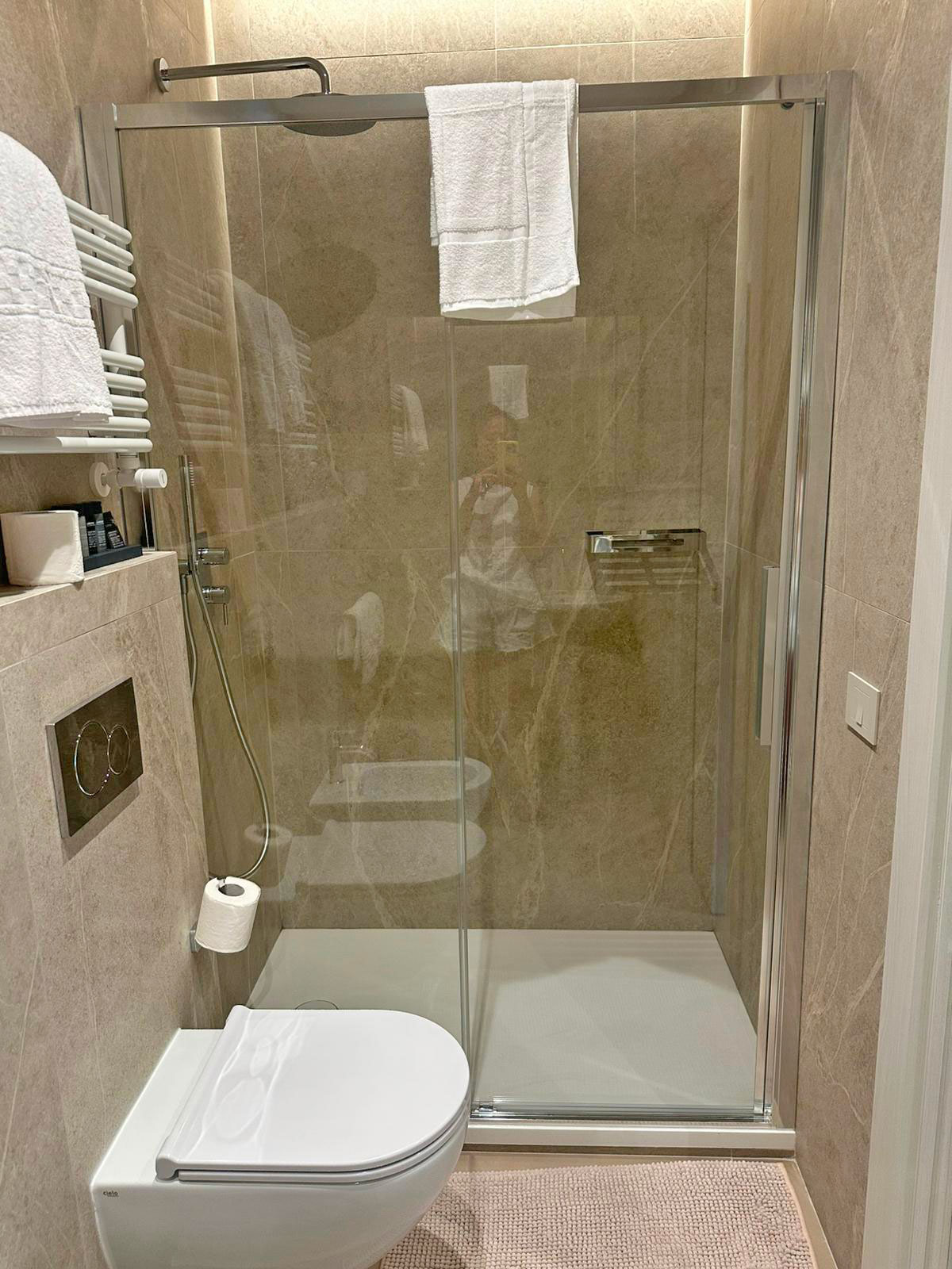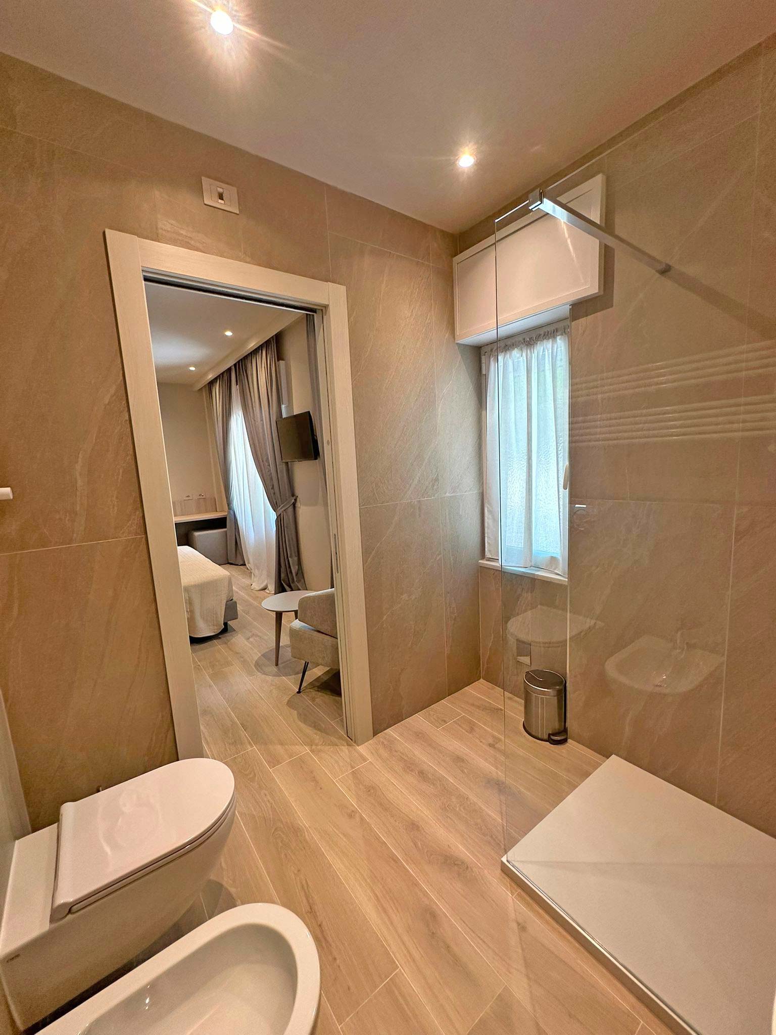 Intimate, elegant guest room with spacious walk-in shower, offers beautiful, lateral sea views