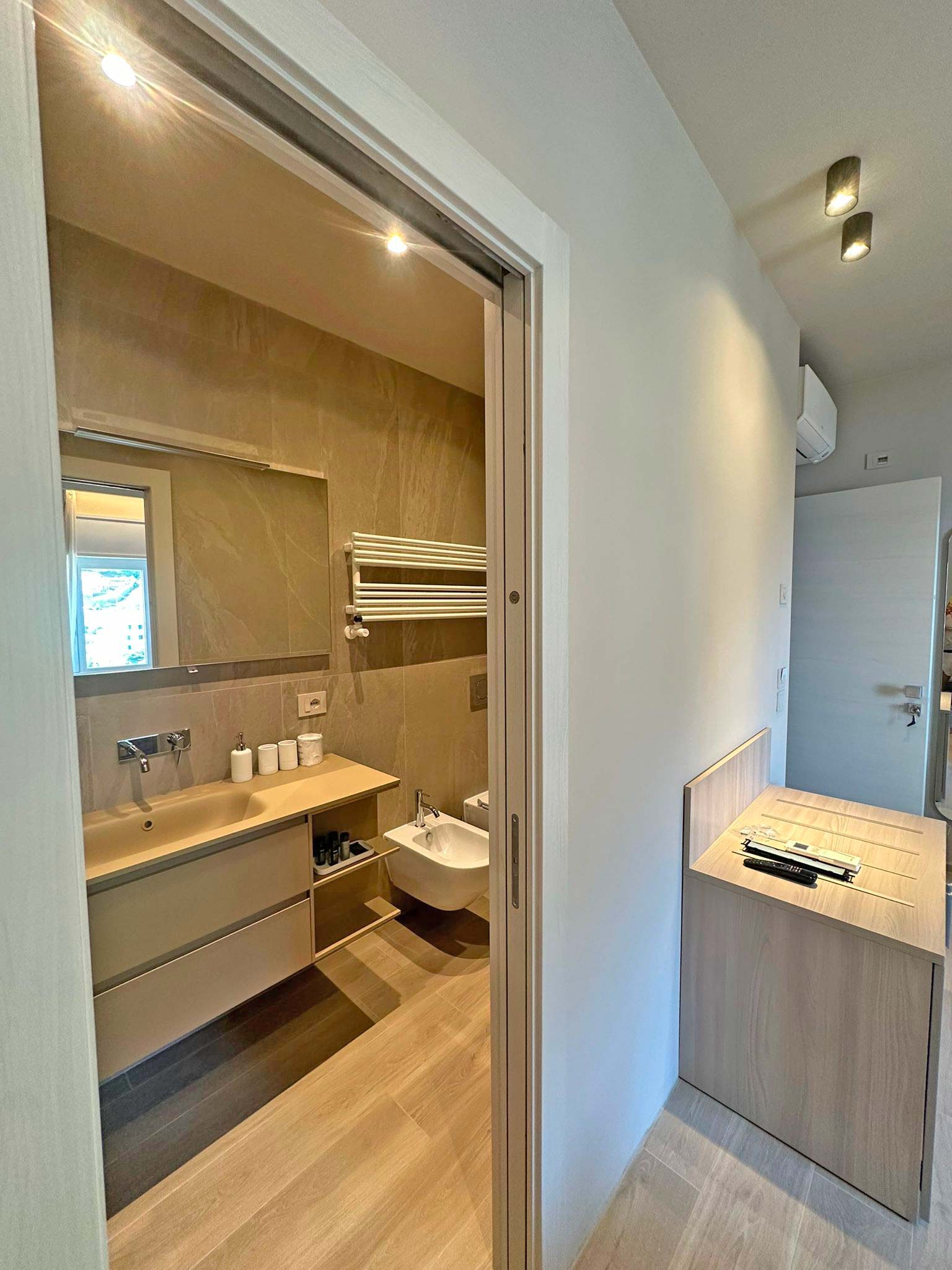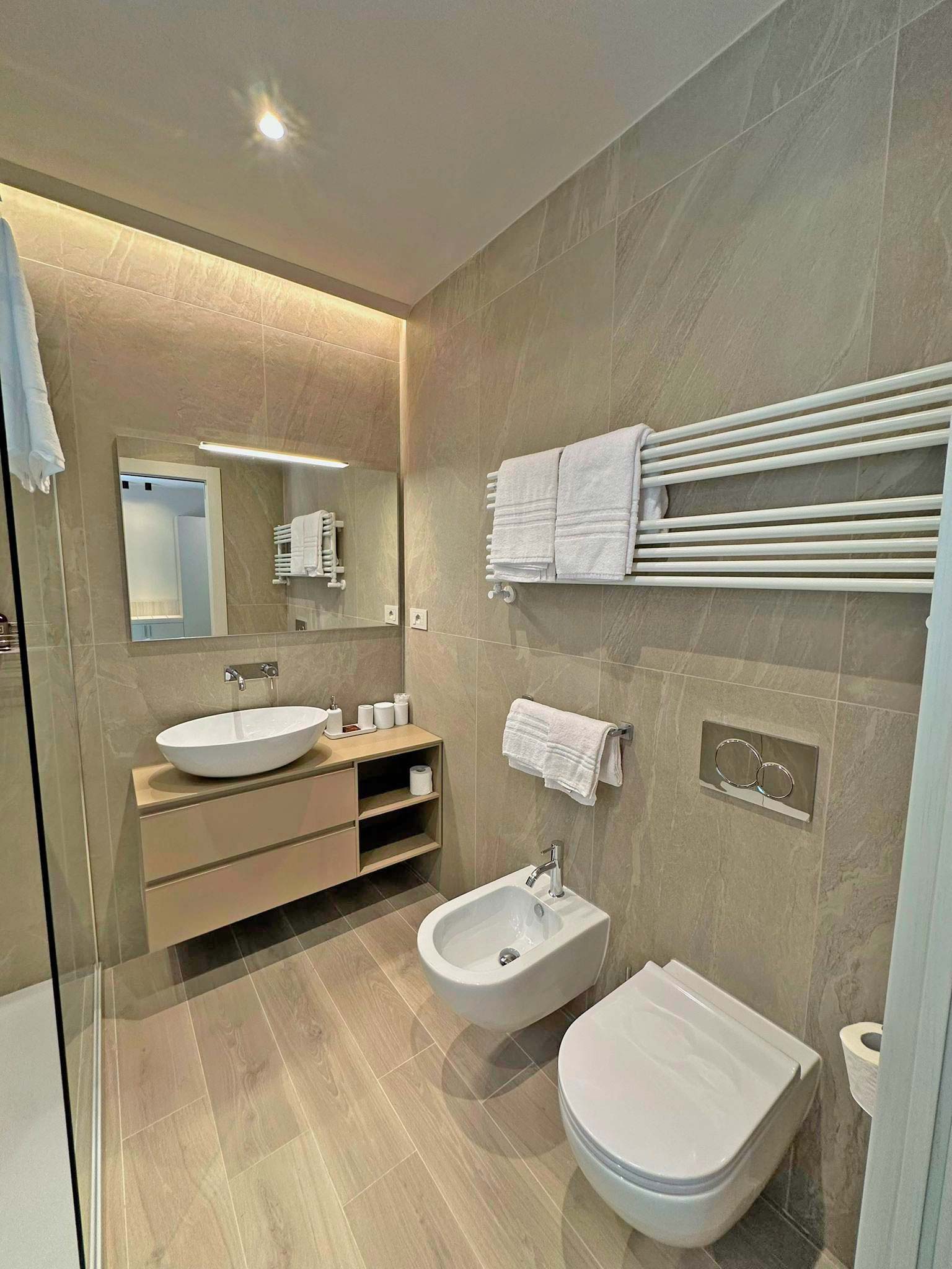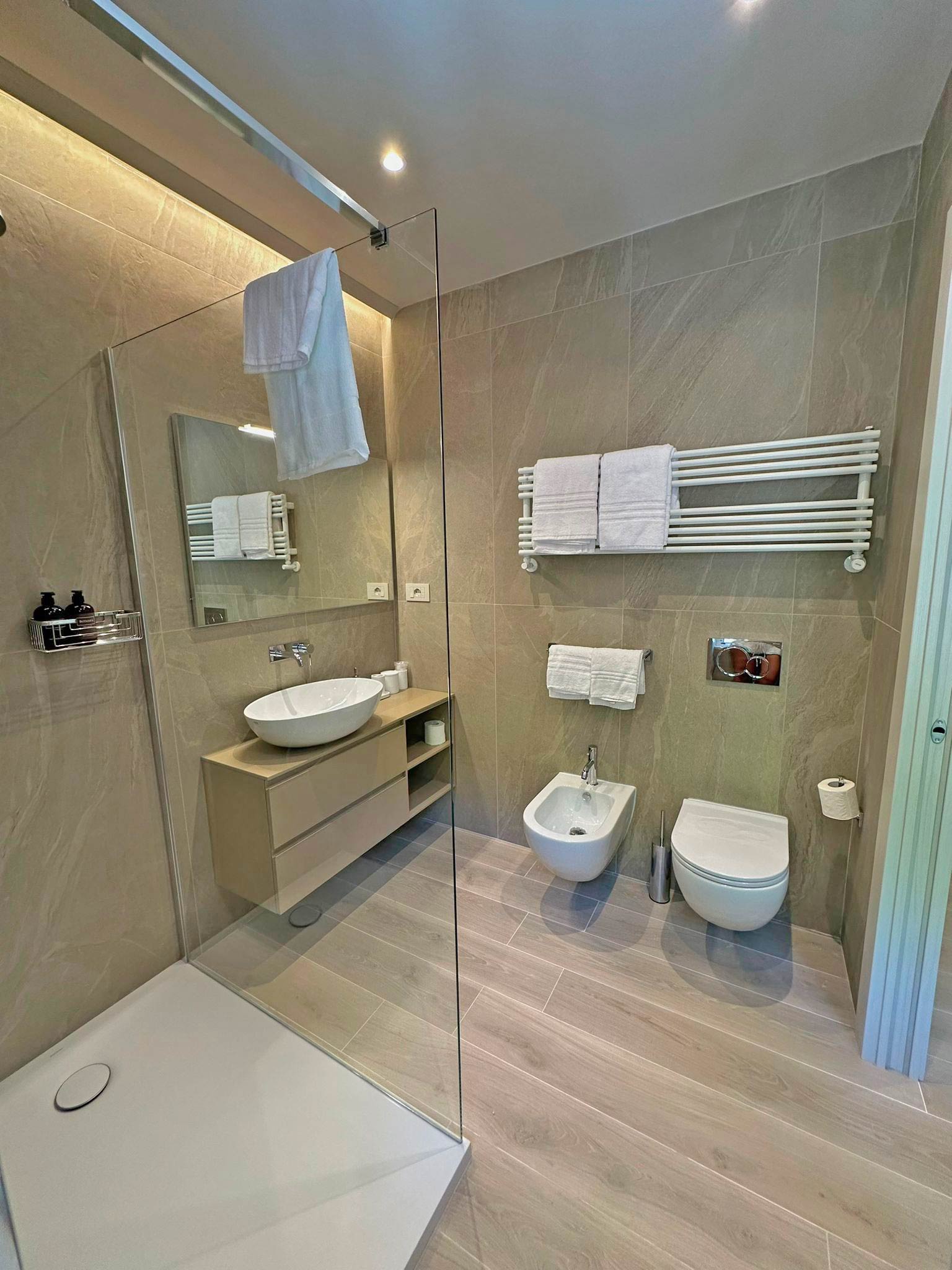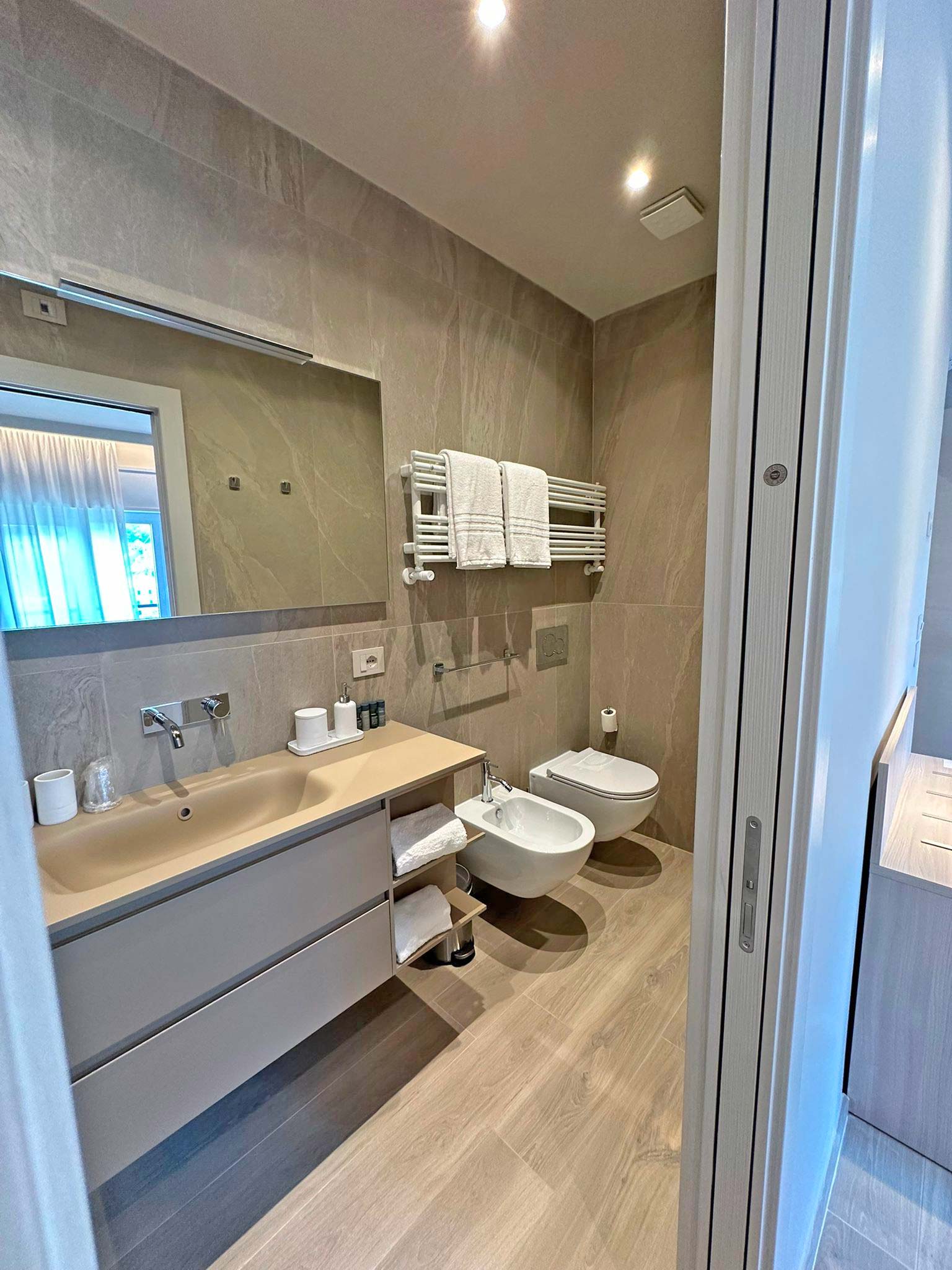 Intimate, elegant guest room with spacious walk-in shower, offers beautiful, lateral sea views